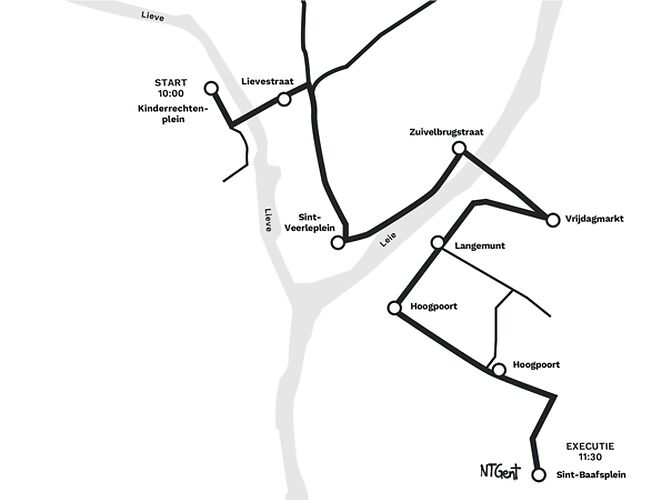 | EXHAUST Exécution du moteur à combustion. Le cortège quitte la Kinderrechtenplein de Gand à 10h00 le 4 mai 2024. L'exécution a lieu à 11h30 sur la place St-Baafsplein à Gand. PLAN DE ROUTE Bienvenue à la première mondiale d'EXHAUST / Ajax : l'exécution du dernier moteur à combustion interne. L'explosion du cœur d'un monstrueux camion. Le condamné est tiré sur une charrette par ses juges. Devant la grande salle du NTGent, la sentence est lue et exécutée. Le moteur à combustion est sacrifié sur l'autel du désastre écologique.